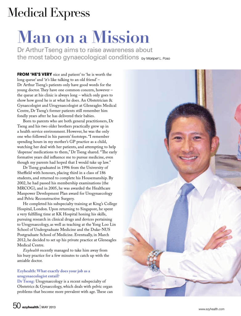 Dr Arthur Tseng is an experienced consultant Obstetrician and Gynaecologist, specialising in Urogynaecology and Pelvic Reconstructive Surgery at Gleneagles Hospital. He obtained his basic medical and professional qualifications from the United Kingdom, before pursuing further training with world renowned Urogynaecologist, Professor Linda Cardozo, at King’s College Hospital, London.